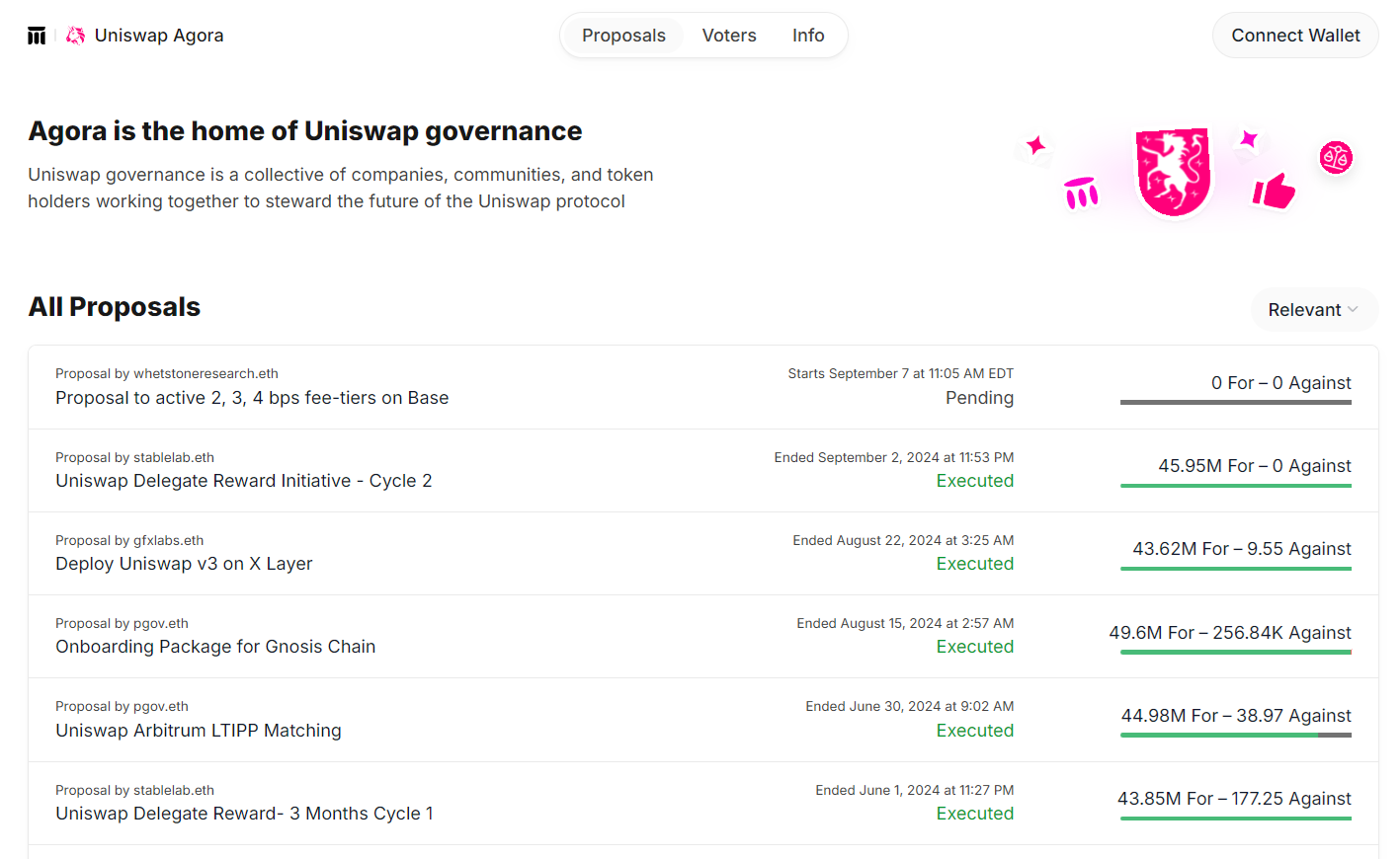 Once a given proposal is ready for an onchain vote, it will appear in the Uniswap voting dashboard - where you can view all current and former Uniswap proposals.